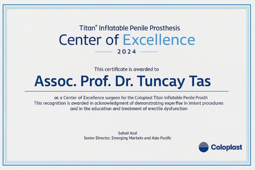 Assoc. Prof. Dr. Tuncay Taş is one of the first three surgeons in Turkey to receive the Center of Excellence certification for penile implant surgery, reflecting advanced surgical expertise, high procedural volume, and consistent patient outcomes.
